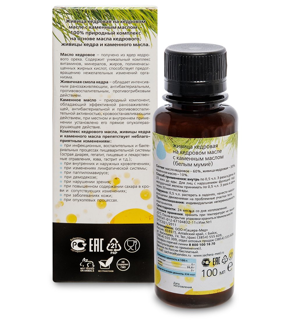 Состав: масло кедровое – 60%, живица кедровая – 30%, каменное масло – 10%.